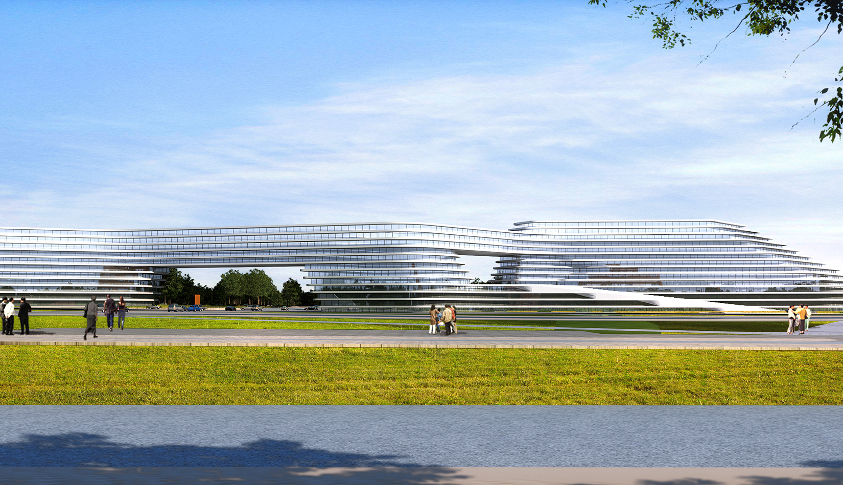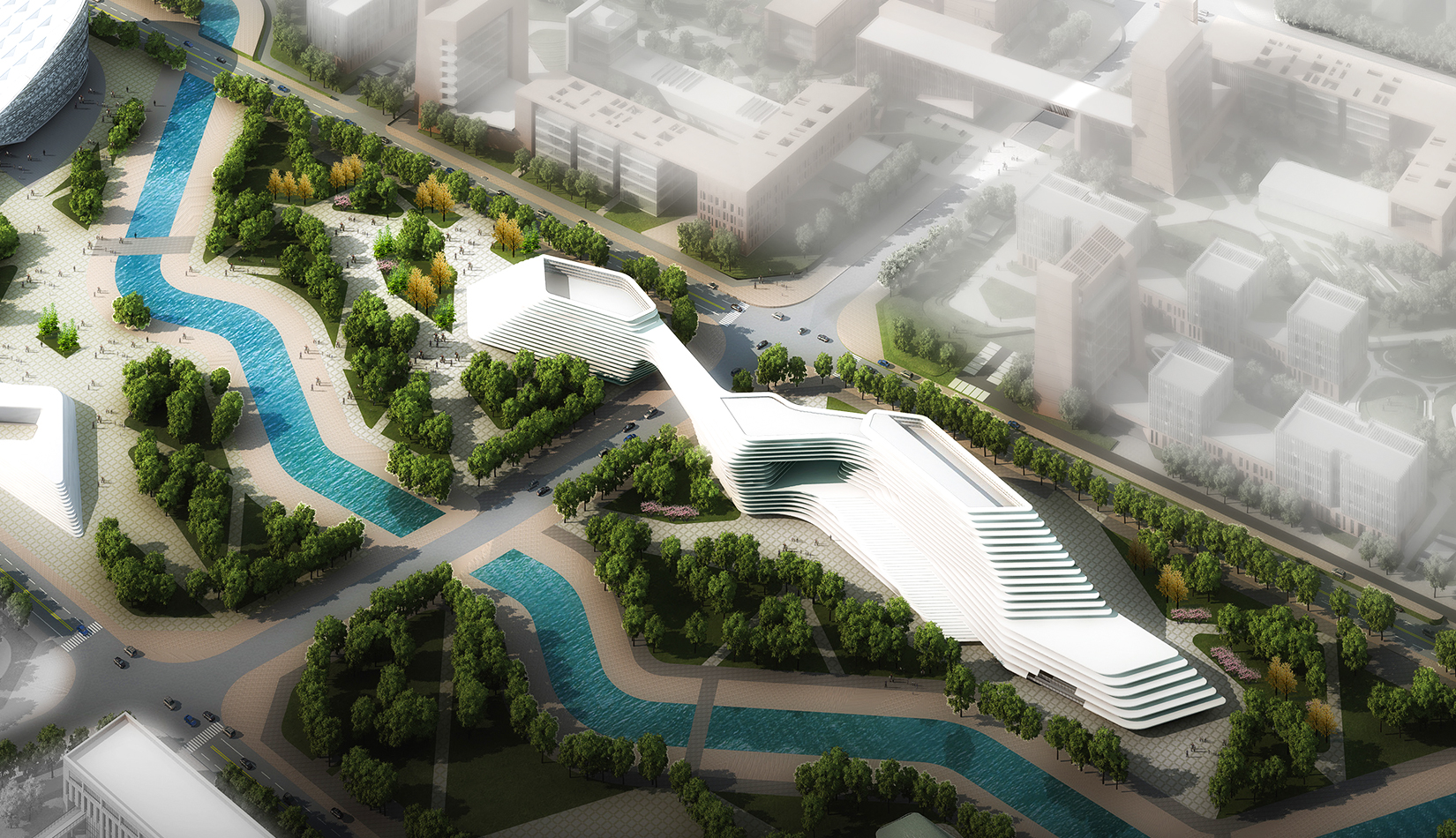 科學(xué)講堂位于中心區(qū)景觀主軸的中心腹地,其南的泄洪渠為景觀主軸的景觀帶。設(shè)計(jì)靈感源于中國(guó)天人合一的自然觀和社會(huì)觀,所謂仁者樂山智者樂水,通過對(duì)山、水肌理的分析與重構(gòu),轉(zhuǎn)換為建筑語言,形成獨(dú)具特色的建筑造型。建筑體量形成簡(jiǎn)單、沖突的場(chǎng)地氛圍,建筑南向正對(duì)園區(qū)中軸線,使得水平向延展的建筑生成了“東高西低”的無邊際界面。由“水面→河岸→場(chǎng)地→建筑”的溪水肌理驅(qū)動(dòng)建筑臨街面,逐步退后產(chǎn)生特有的河流沖刷意象。水流的蜿蜒曲折使建筑的轉(zhuǎn)彎處成洞,達(dá)到了內(nèi)外視線連續(xù)的綜合效果,并將對(duì)建筑的擠壓力平衡到建筑東西兩翼。建筑表皮通過對(duì)水的情緒變化等模擬,形成片狀的建筑造型。