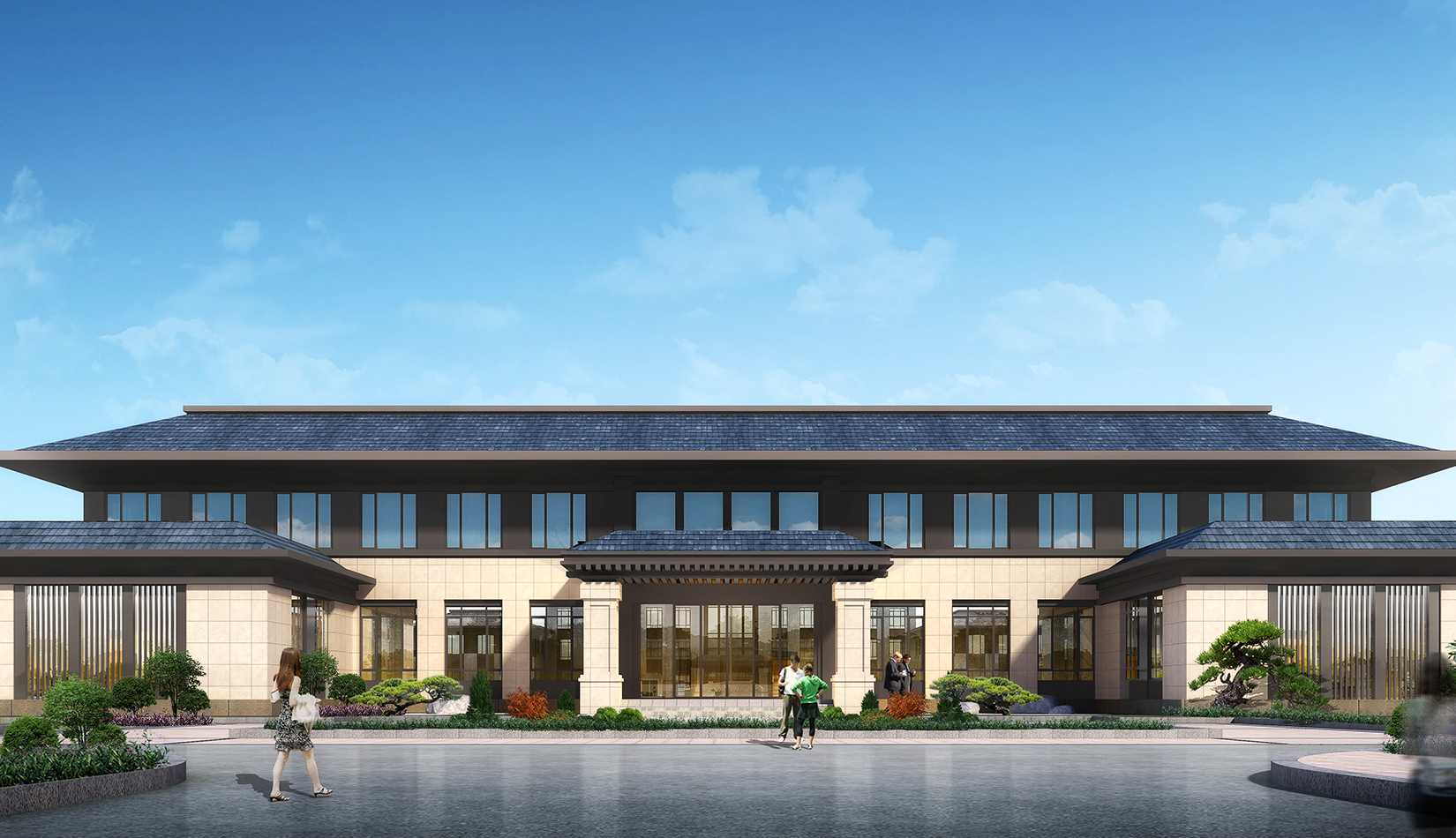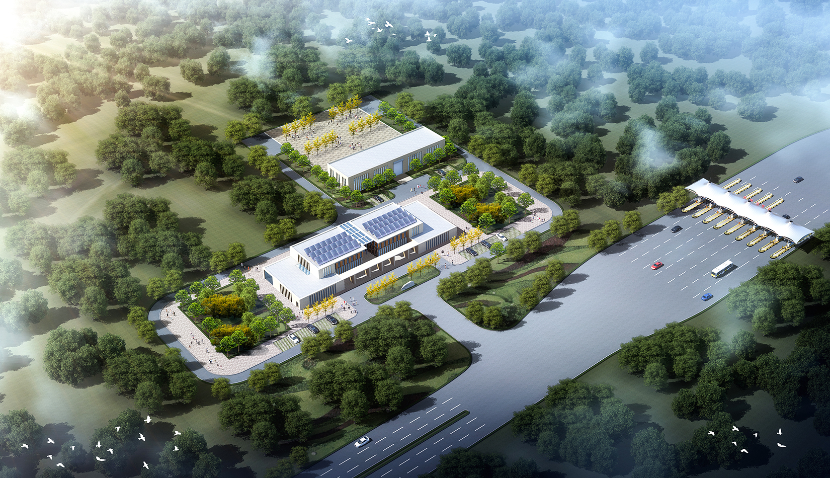 新機(jī)場(chǎng)高速公路是膠東國(guó)際機(jī)場(chǎng)集疏運(yùn)系統(tǒng)的重要組成部分,是連接我市主城區(qū)的迎賓大道。主線(xiàn)收費(fèi)廣場(chǎng)作為青島的門(mén)戶(hù),旅客來(lái)青的第一印象,方案設(shè)計(jì)充分體現(xiàn)青島城市特征,建筑形式與新機(jī)場(chǎng)航站樓“海星”造型相互呼應(yīng),從“建筑風(fēng)格、視覺(jué)傳達(dá)、空間感受”三個(gè)方面完善方案設(shè)計(jì),遵從生態(tài)環(huán)保原則,實(shí)現(xiàn)收費(fèi)雨蓬、站房、生態(tài)環(huán)境協(xié)調(diào)統(tǒng)一,結(jié)合地域特色與地產(chǎn)描畫(huà),展現(xiàn)城市海洋文化。