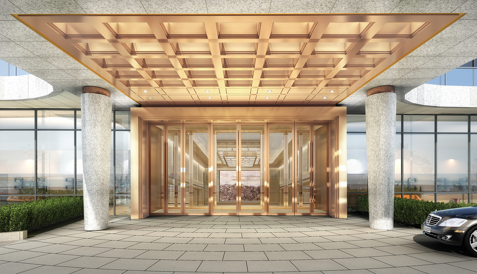 一層走廊---走廊為大廳一部分延續(xù)迎賓大廳的設計風格,天花跌級有序,方圓向上,內嵌如意紋理淺雕銅板, 增加厚重、文化與層次,墻面挺拔向上轉折有序,頭尾嵌入水紋樣式銅板雕刻,增加儀式感與莊重性,同時提升文化附加,簡練現(xiàn)代、精致細節(jié),突顯別致有序、莊重典雅。