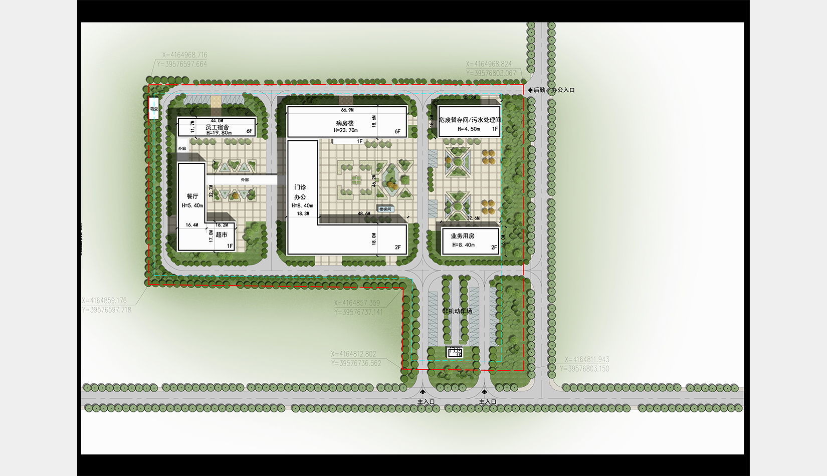 景觀設(shè)計(jì)采用圍合、穿插、滲透等設(shè)計(jì)手法,營(yíng)造公園式景觀綠化,與建筑群體融合呼應(yīng),打造一個(gè)會(huì)呼吸多元化的綠色醫(yī)院,利用建筑之間的圍合關(guān)系,創(chuàng)造動(dòng)態(tài)的具有生命力的局部景觀。