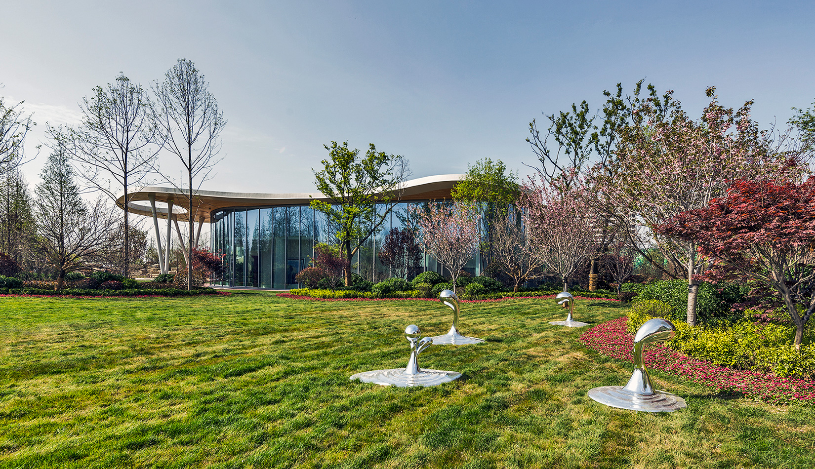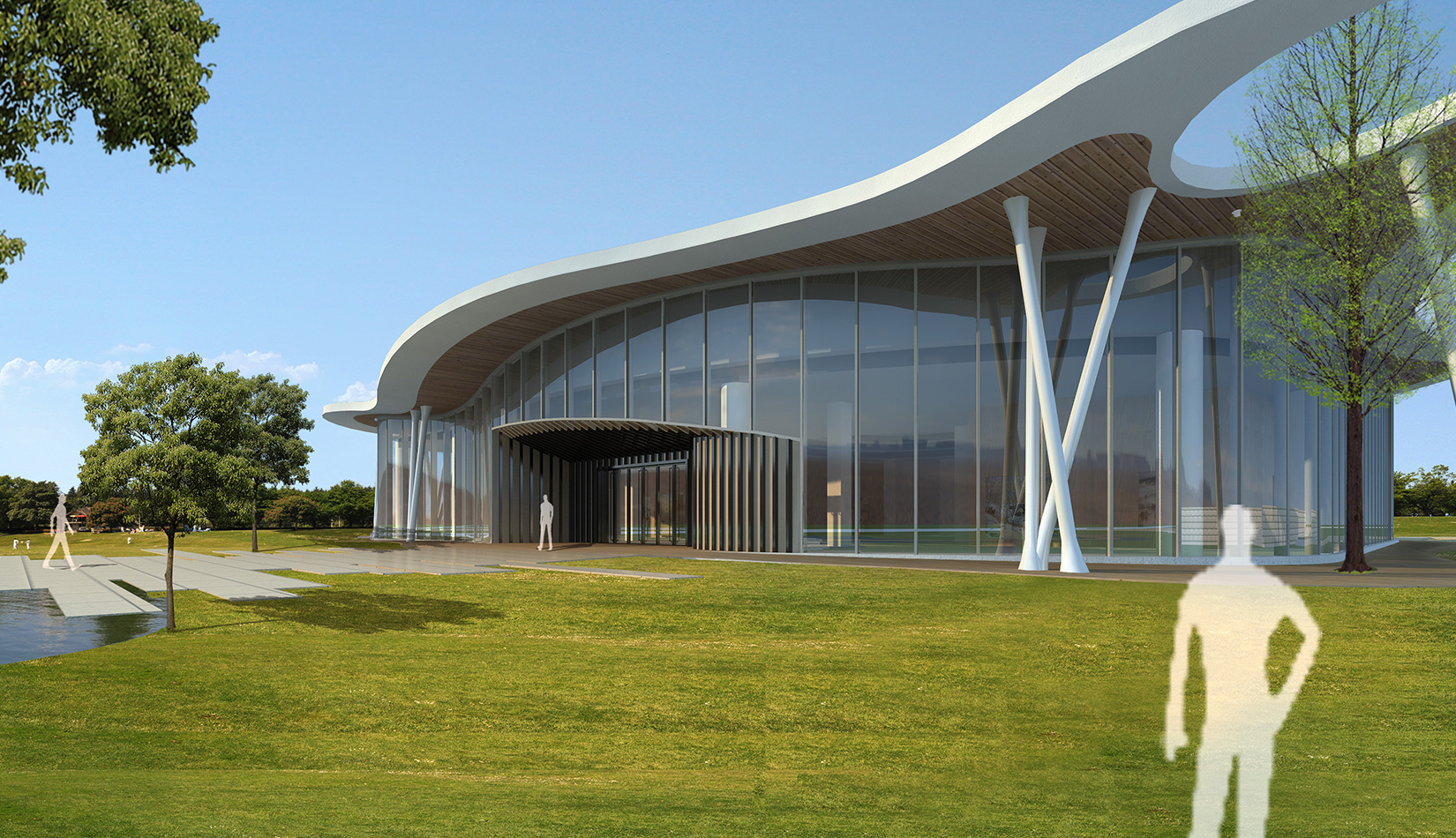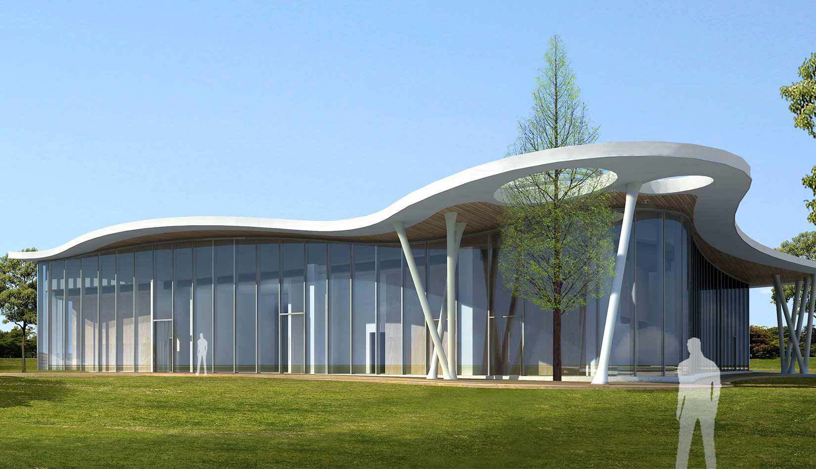 該項(xiàng)目以“森林中的小屋”為理念,通過“自由流水形態(tài)的木質(zhì)屋頂加純凈的玻璃幕墻”的組合,從而達(dá)到建筑與自然的共生,使得建筑真正的融合于自然風(fēng)景之中。設(shè)計(jì)師將節(jié)能、