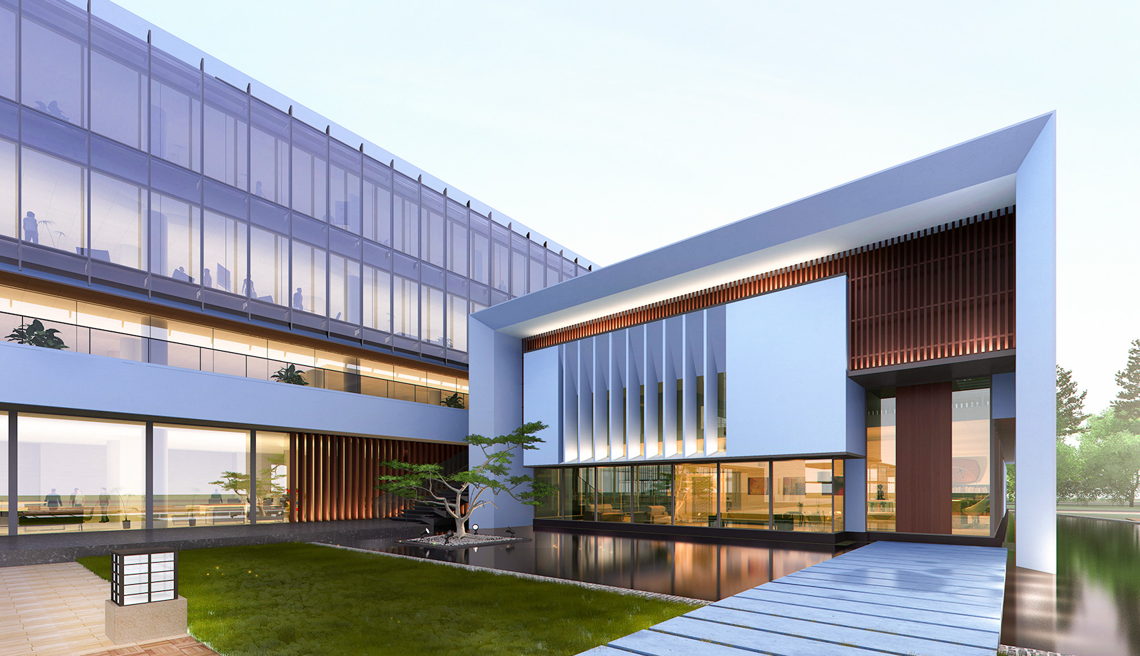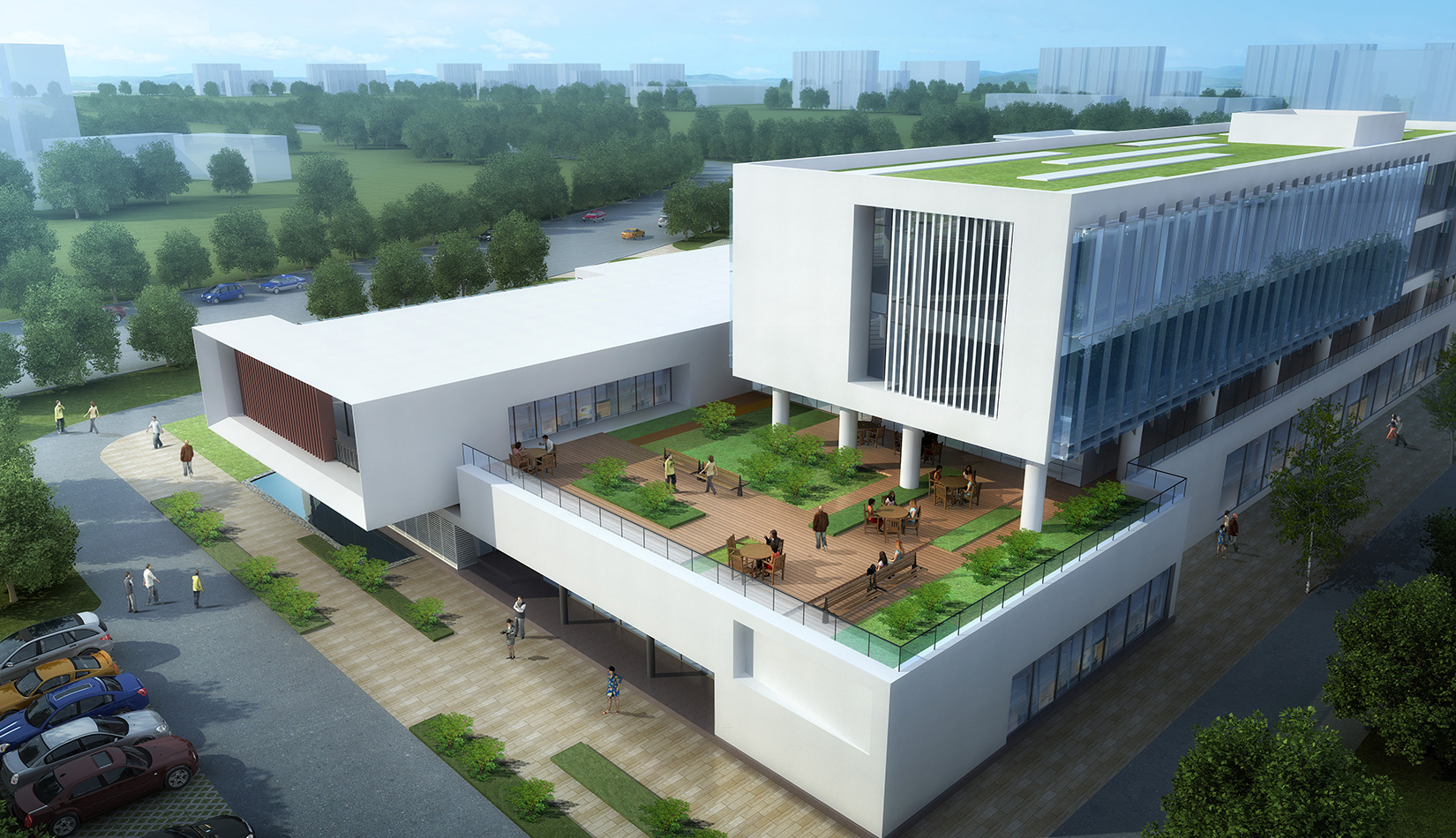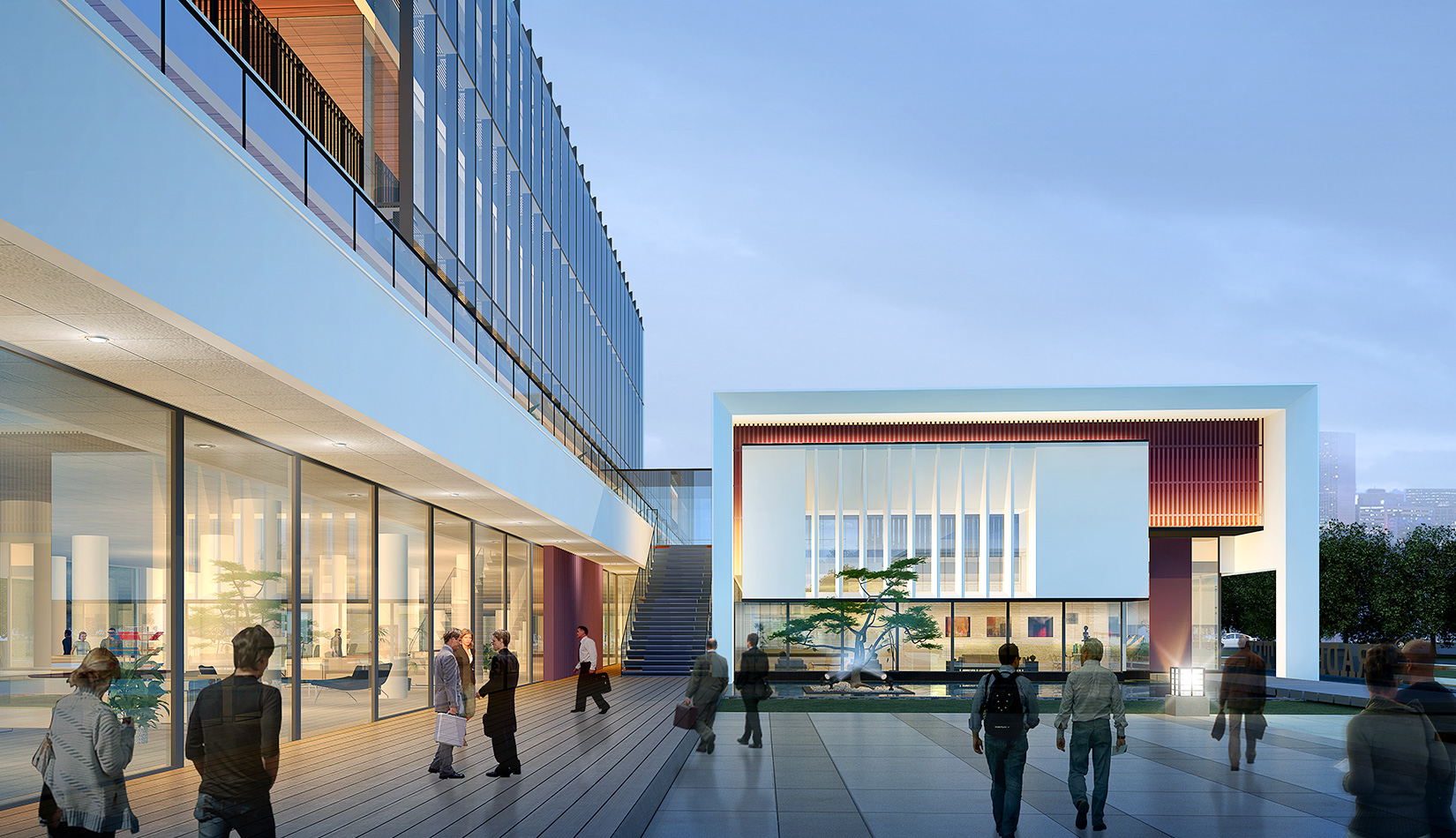 作為中韓貿(mào)易合作區(qū)一期啟動區(qū)的重點項目,其承擔(dān)著對外展示以及為后續(xù)發(fā)展提供服務(wù)平臺的功能。因此設(shè)計力求穩(wěn)重大氣,以4 層的體量打造出地標(biāo)性的建筑。設(shè)計運(yùn)用簡潔的外形、寧靜的色彩,外立面以白色涂料和木格柵為主,尊重自然,打造一種平和寧靜的感覺。在空間設(shè)計上通過共享空間、上人露臺和一層大平臺,創(chuàng)造出舒適宜人的工作環(huán)境;在技術(shù)上通過地源熱泵、呼吸式幕墻、雨水收集等的應(yīng)用,實現(xiàn)建筑的綠色節(jié)能環(huán)保。